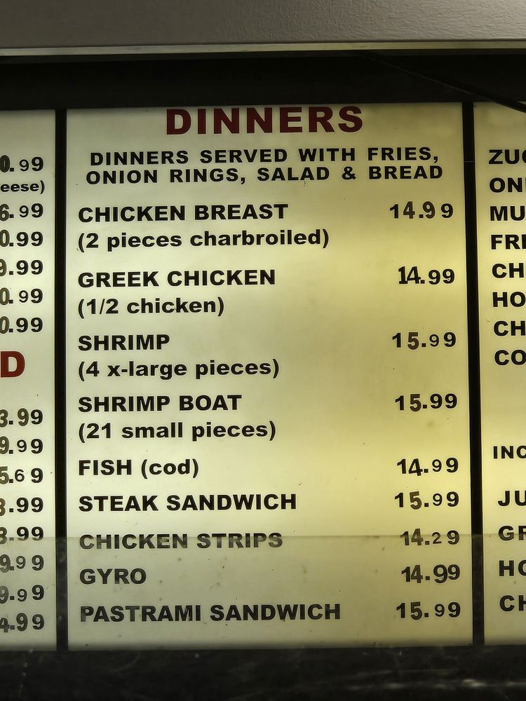 4 pc. XL shrimp, French fries, 3 pc. onion rings, dinner roll, dinner salad (lettuce, tomato, cucumber, pepperoncini).