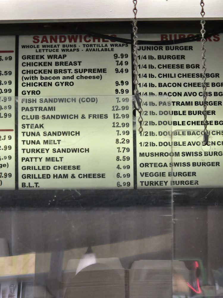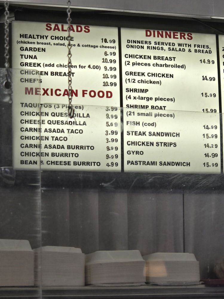 Pastrami sandwich, French fries, 3 pc. onion rings, dinner salad (lettuce, tomato, cucumber, pepperoncini).