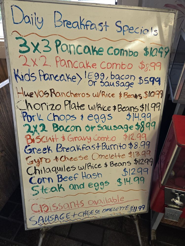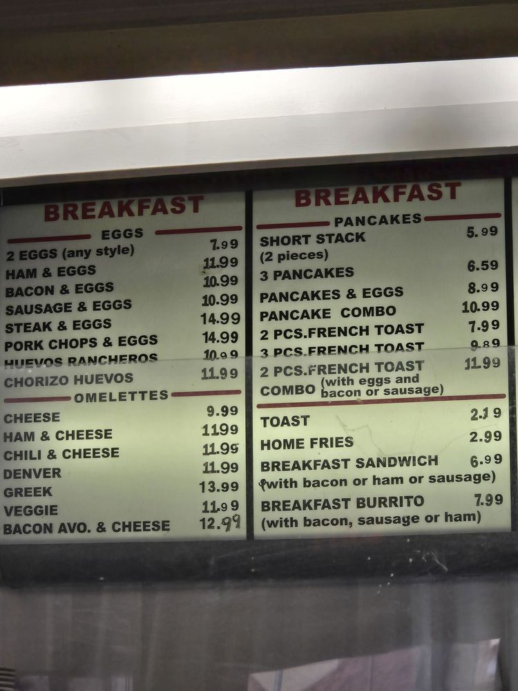 The menu features satisfying breakfast options such as classic Bacon & Eggs and hearty Steak & Eggs, while their omelettes range from a simple Cheese Omelette to more adventurous combos like Bacon Avocado & Cheese. For those with a sweet tooth, the Pancake Combo stands out, offering a delightful trio of pancakes paired with eggs and your choice of crispy bacon or sausage.